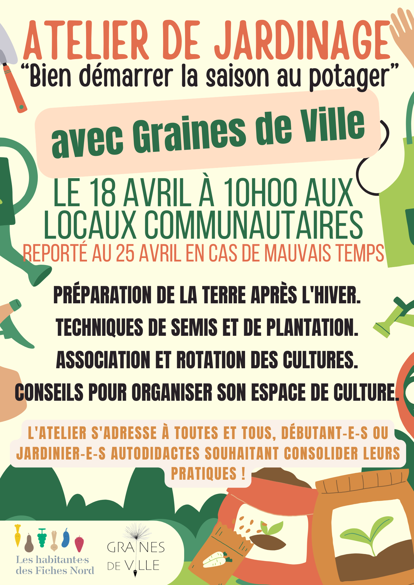 Participez gratuitement à l’atelier de jardinage organisé par l’Association et Graines de Ville le samedi 18 avril (reporté au 25 avril en cas de mauvais temps) dès 10h00 aux locaux communautaires.