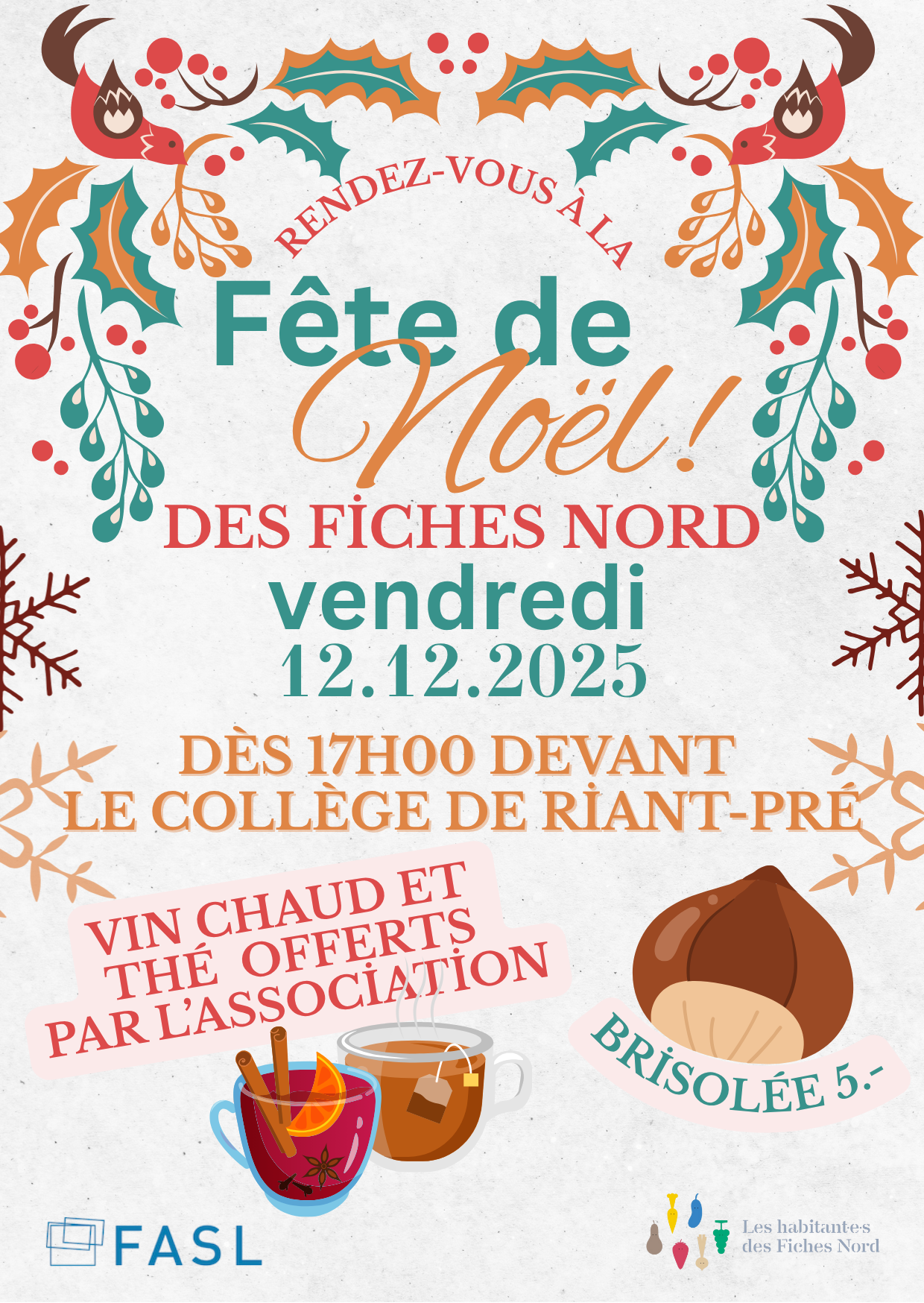 Dès 17h00, l’Association du quartier vous offrira du thé et du vin chaud, et vous proposera également une portion de brisolée à 5CHF.
