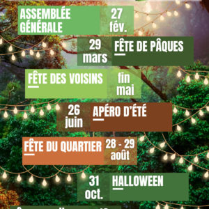 Voici les dates des événements prévus pour 2026: 27 février: Assemblée générale 29 mars: Fête de Pâques fin mai: Fête des voisins 26 juin: Apéro d’été 28-29 août: Fête de quartier 31 octobre: Halloween 18 décembre: Fête de Noël